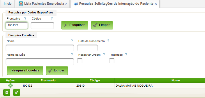 2ª OPÇÃO - Acesse: PESQUISA SOLICITAÇÃO DE INTERNAÇÃO DO PACIENTE> Pesquise pelo PRONTUÁRIO do paciente.